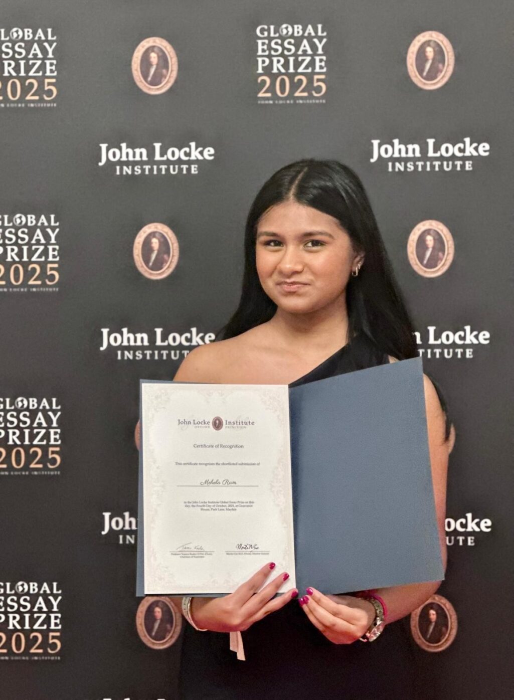 Mehela earned this honour after being shortlisted from over 63,000 entries in the 2025 John Locke Global Essay Competition — an incredible achievement! She competed in the Senior Politics category, writing on the topic of diversity, with essays judged by academics from top universities including Oxford and Princeton.