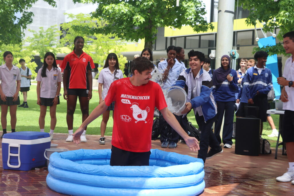 Students answered trivia questions for the chance to choose a teacher to drench — and our brave staff stepped up in style!